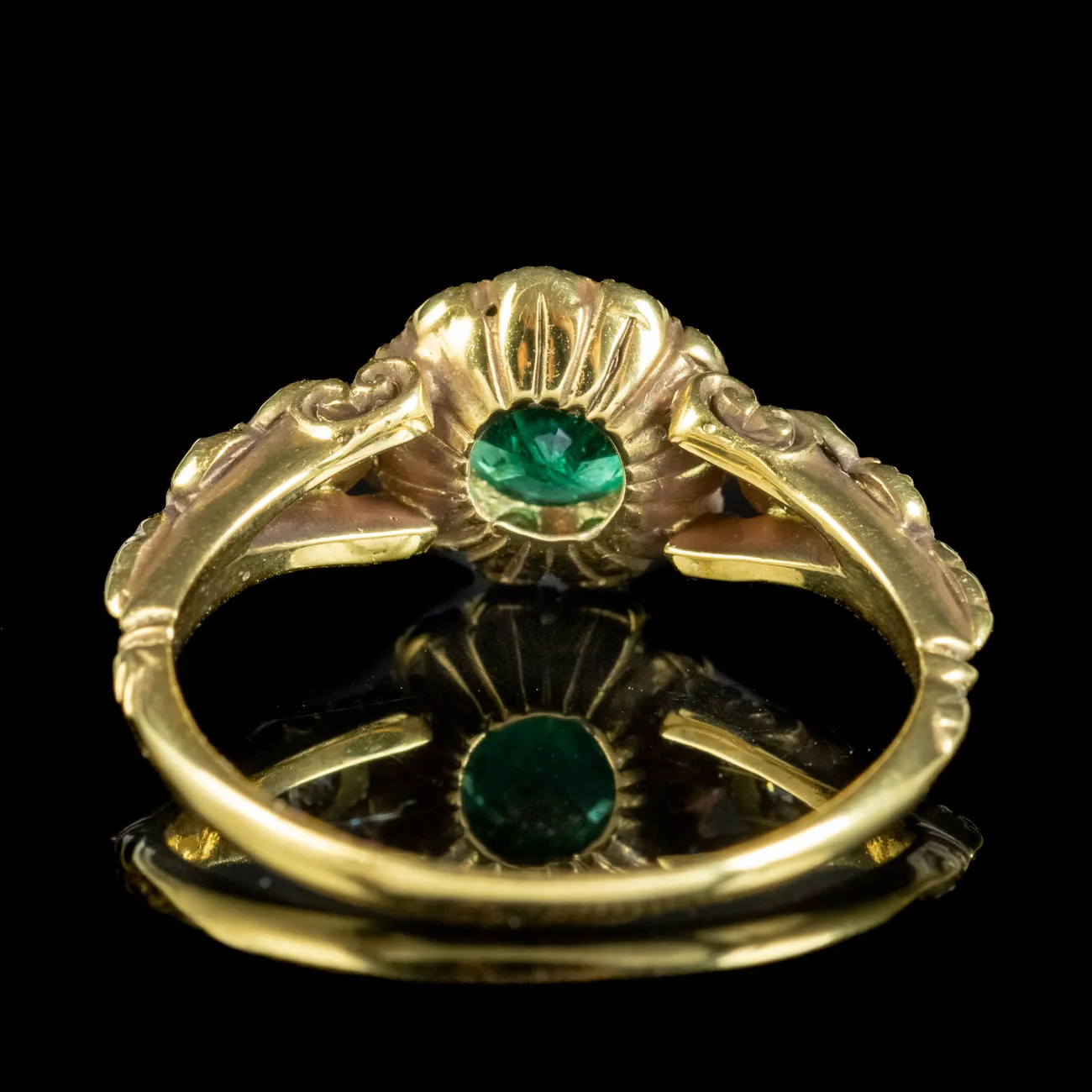 A gorgeous Victorian inspired ring adorned with a flower shaped cluster of bright, brilliant cut diamond petals, haloing a vivid green emerald in the centre (approx. 0.75ct). Two additional diamonds are also dotted down each shoulder and bring the total to approx. 0.80ct.
